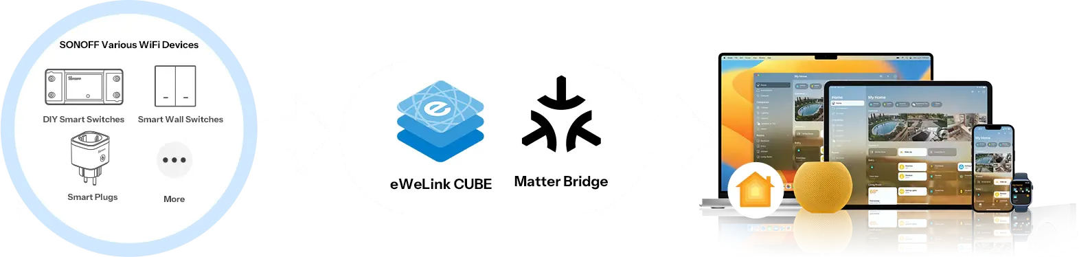 Seamlessly connect SONOFF WiFi devices to Matter via CUBE OS built-in Matter Bridge-- free, local, and ready for Apple Home, Google Home, Alexa, SmartThings, and Home Assistant.