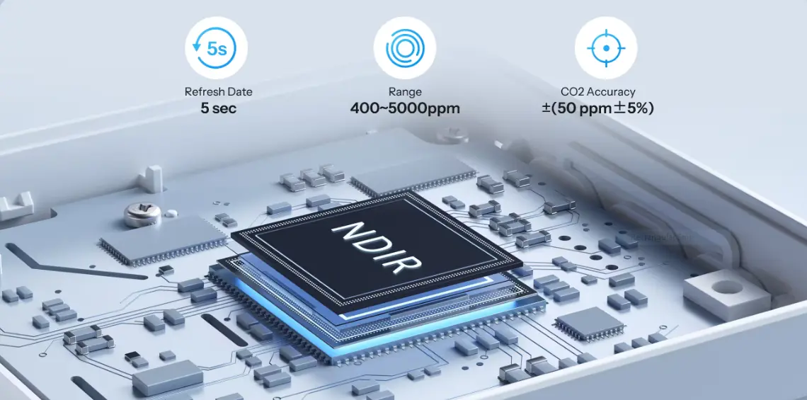 【High Precision & Rapid Sensing】Engineered with professional-grade accuracy using an NDIR sensor delivering ±(50 ppm + 5%) precision. Refreshes every 5 seconds to ensure timely updates on changing air conditions.