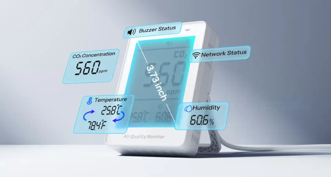 【Multi-Metric Environmental Monitoring】Simultaneously tracks and displays temperature, humidity, and CO2 levels, with support for switching temperature units to fit your preferences.